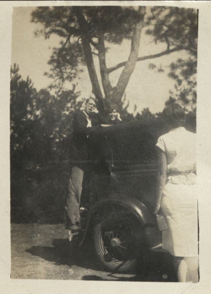 Subject: Harry Hawkins Jr. and probably Nathelle "Sis" Laing (rather than Harry's sister Isabel Hawkins) at Madelene Beuttler's automobile at Brent School. Madelene's nickname was Peaches; she was a d