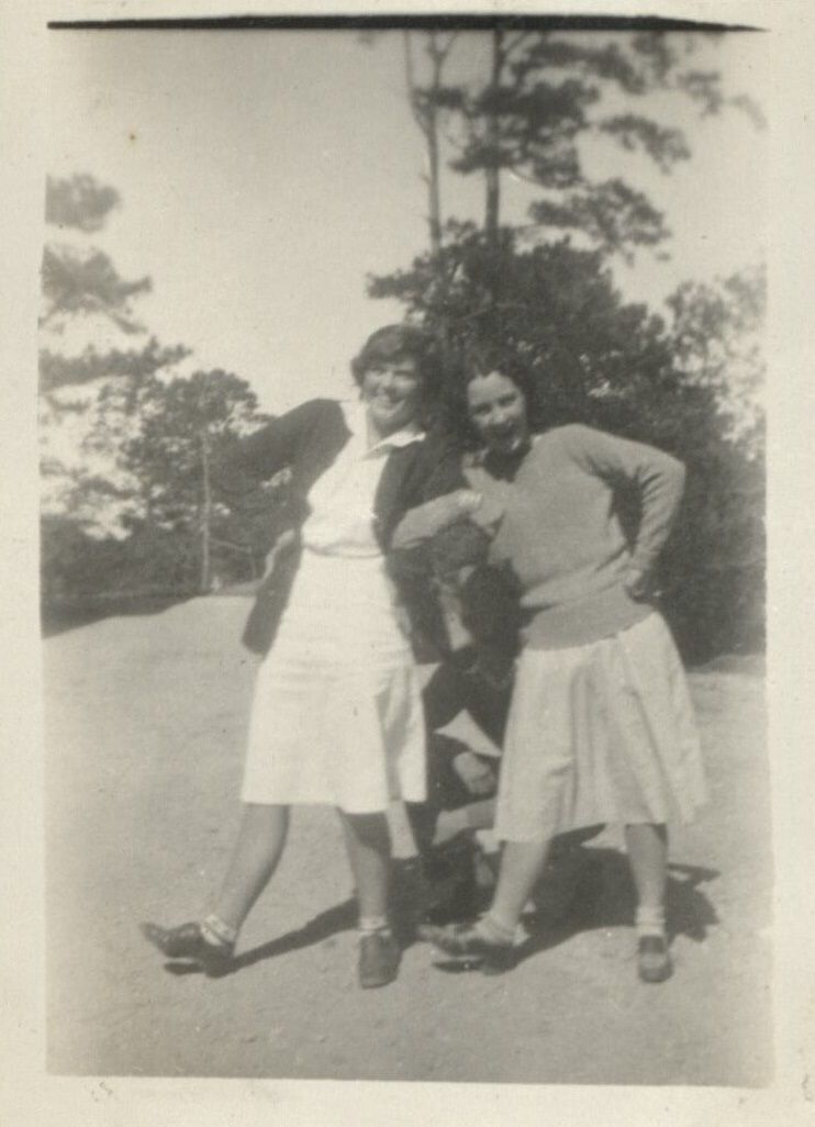 Subject:Probably Nathelle "Sis" Laing (rather than Harry's sister Isabel Hawkins) and Charmain Phipps link arms and dance while Wallace Cromwell Palmer III crouches behind at Brent School. Crom's life