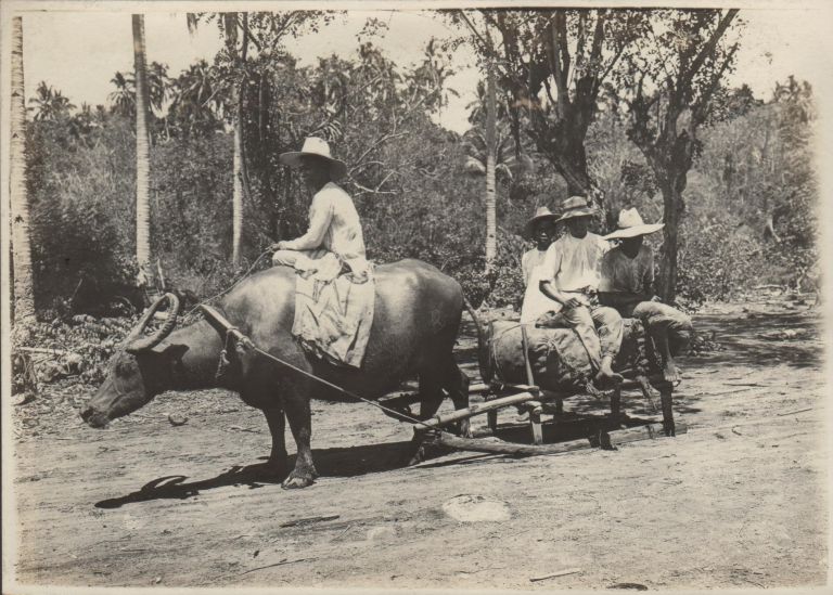 Sled drawn by carabao bringing copra to the market at Barrio Mojon, Laguna, P. I.