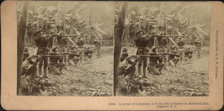 Kilburn #B13569. U.S. soldiers in standing and kneeling firing positions in a clearing by banana plants, Angeles, Pampanga, Philippines.