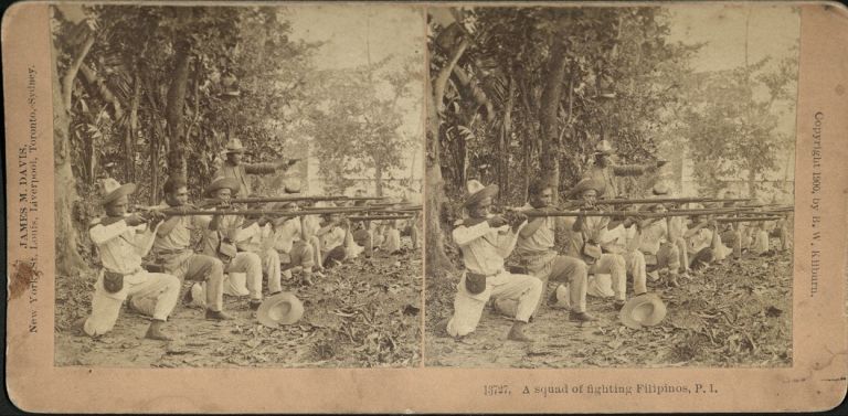 Kilburn #B13727a. Line of Filipino soldiers firing rifles while kneeling along edge of forest.