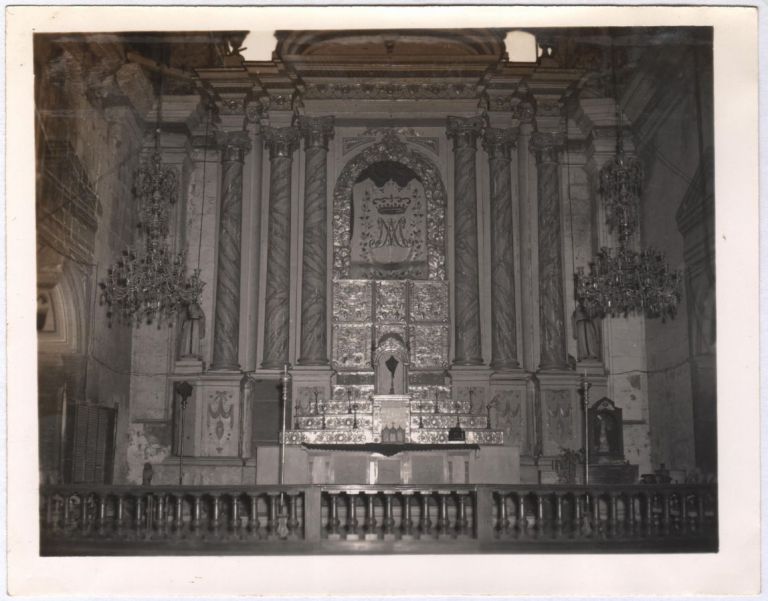 Post-war view of the altar, retable and columns inside San Agustin Church, located inside the historic walled city of Intramuros in Manila. San Agustin is the only one of seven churches of Intramuros to survive a leveling by combined American and Filipino ground forces in May 1945.