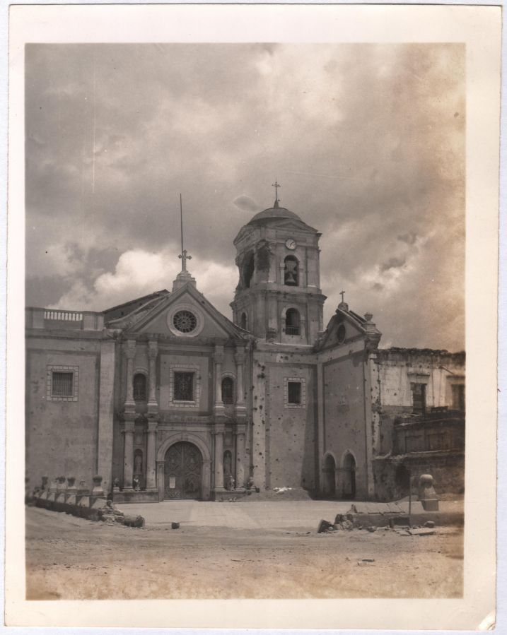 Post-war view of the facade and bell tower of San Agustin Church, located inside the historic walled city of Intramuros in Manila. San Agustin is the only one of seven churches of Intramuros to survive a leveling by combined American and Filipino ground forces in May 1945.