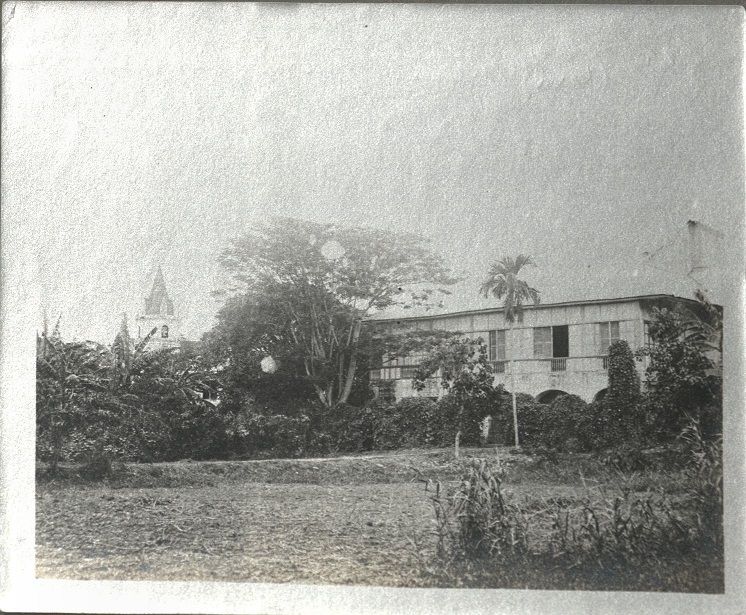 Subject: The house and grounds of what is called "Santa Ana Mess" in this album, a house on the banks of the Pasig River in the Santa Ana district of Manila. Note the bell tower of the Santa Ana churc
