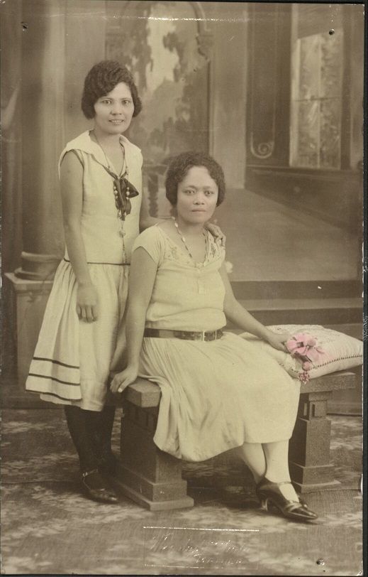 Subject: Studio photograph of two Filipinas, presumably mother and daughter. Dresses and flowers have been colored. The younger woman standing is identified as a mestiza.