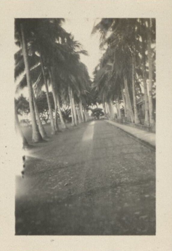 Subject: Coconut palms line both sides of a street near the house where the Hawkins family stayed while in Legaspi City.