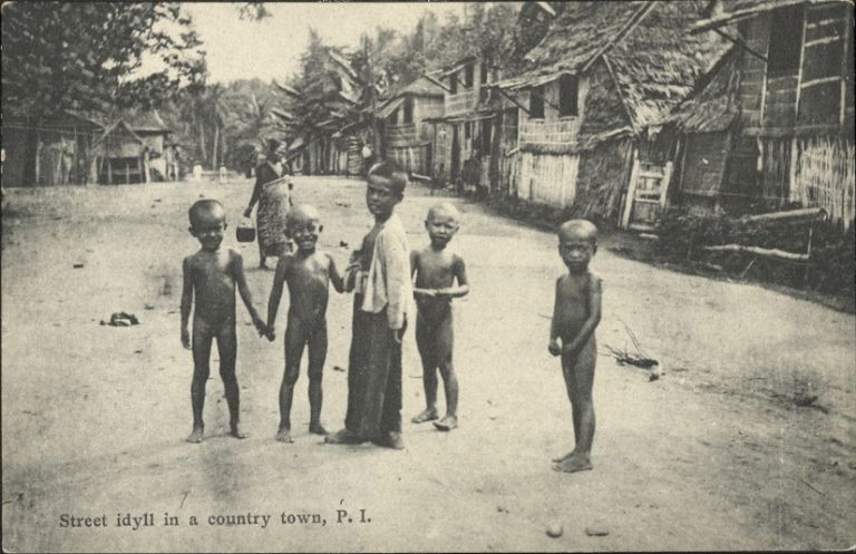 Subject: Group of boys, mostly naked, play in the street of a Philippine village, series of nipa houses in background.