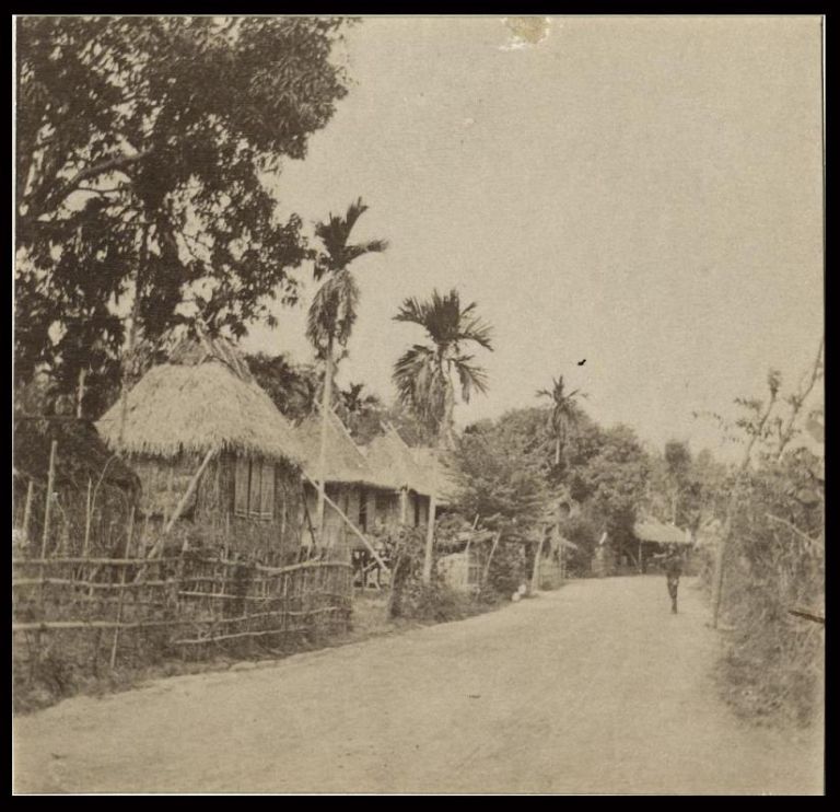 Subject: An unremarkable view of a Manila road or street, with nipa huts and bamboo fences.