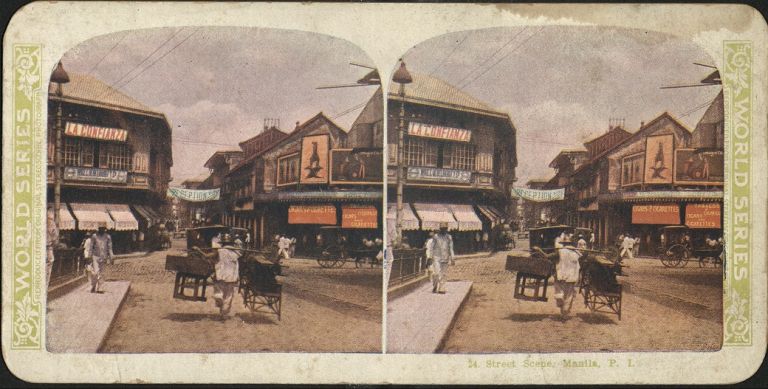 World Series #WS24. Busy intersection in commercial district of Manila with pedestrians, calesas, and man carrying furniture.