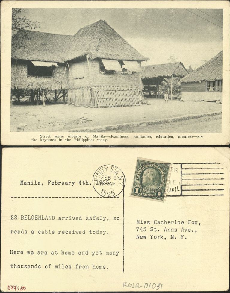 Subject: Neatly kept nipa huts on a tidy street near Manila, several children in windows.