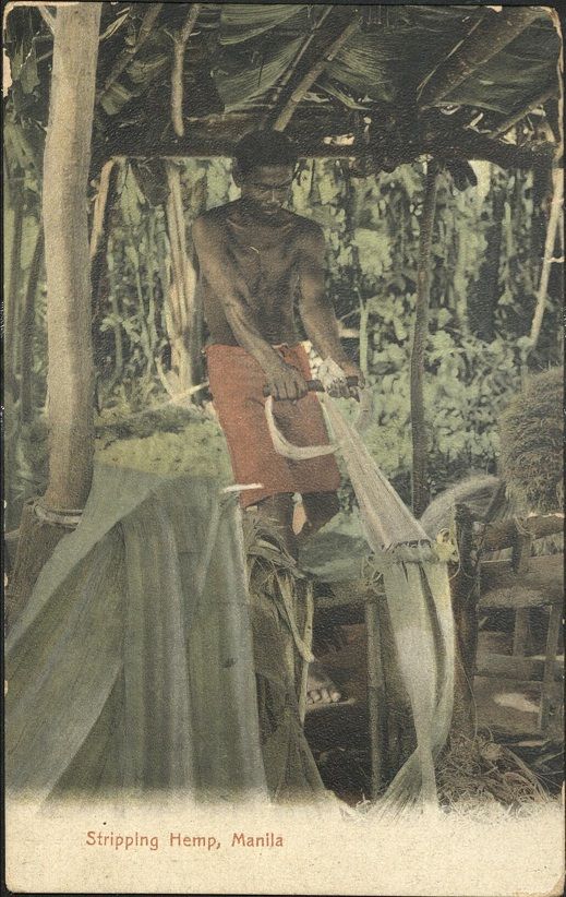 Subject: Filipino man pulling hemp fibers from leaves in a shed. Same image as OFI-000393.