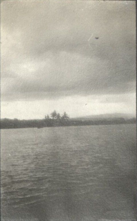 Subject: Sunset behind low clouds over a bay, probably near Legaspi City in Albay Province.