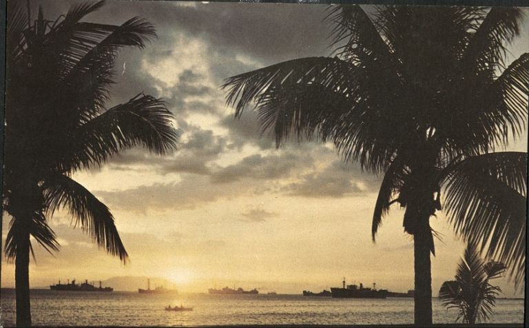 Subject: Sunset at Manila Bay seen though palm trees and over many ships at anchor.