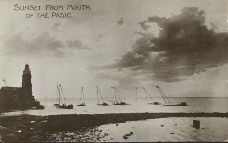 Subject: View toward Manila Bay from mouth of Pasig River, fishing boats center, lighthouse on left.