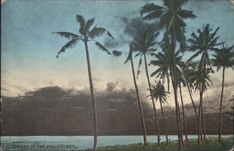 Subject: Group of tall palms silhouetted against evening sky out to sea. Same image as ROJR-000876, attributed to Tacloban, Leyte.