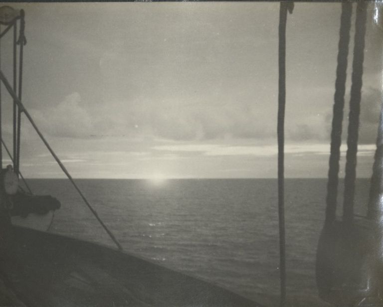 Subject: "Southern waters" from an American perspective, but this is still a sunset in the northern hemisphere, as seen from an inter-island steamer. Lifeboats and tackle frame the view.