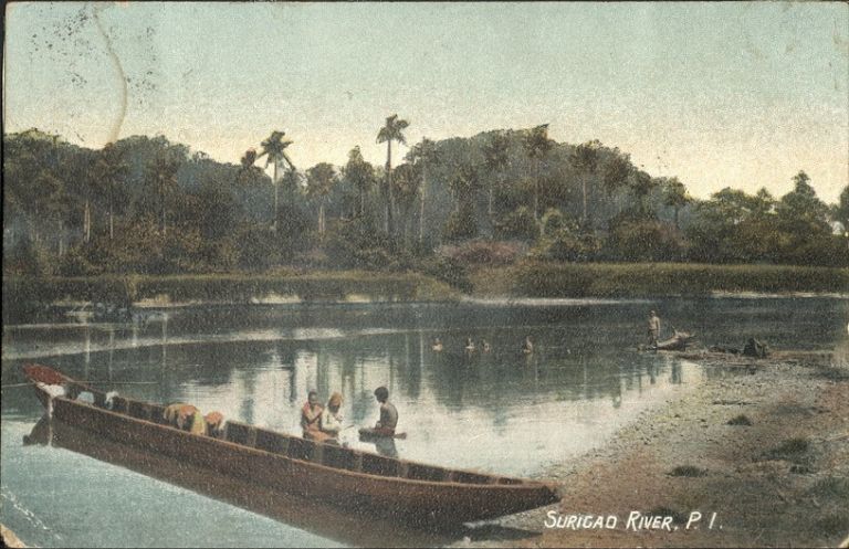 Subject: Surigao River scene in Surigao del Norte province: boat on river bank with people bathing in distance.
