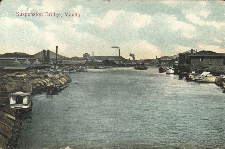 Suspension bridge in far distance, boats on either side of Pasig River in Manila. Construction on the Puente Colgante suspension bridge across the Pasig River started in 1849 and was completed in 1852.