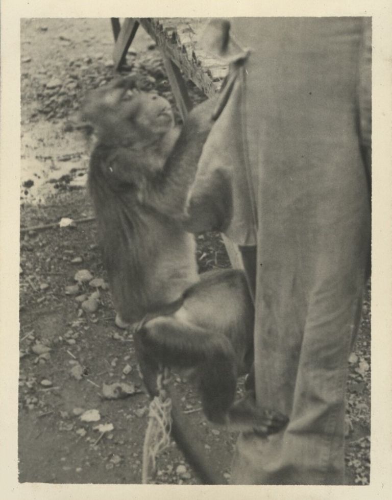 Subject: "Suzie" appears to be a pet monkey kept on a leash or in a cage at the barracks of the 29th Engineers. Being young soldiers, the Engineers apparently enjoyed getting Suzie drunk on beer.