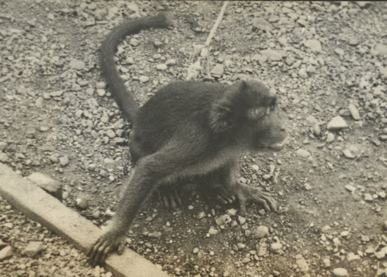 Subject: "Suzie" appears to be a pet monkey kept on a leash or in a cage at the barracks of the 29th Engineers. Being young soldiers, the Engineers apparently enjoyed getting Suzie drunk on beer.