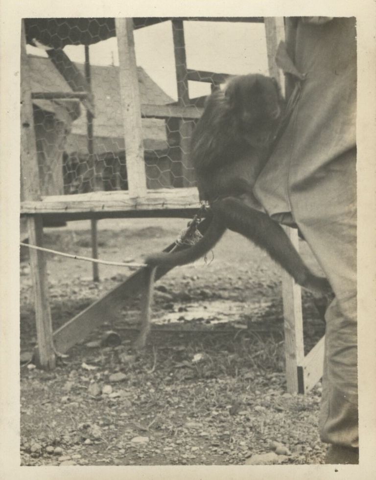 Subject: "Suzie" appears to be a pet monkey kept on a leash or in a cage at the barracks of the 29th Engineers. Being young soldiers, the Engineers apparently enjoyed getting Suzie drunk on beer.