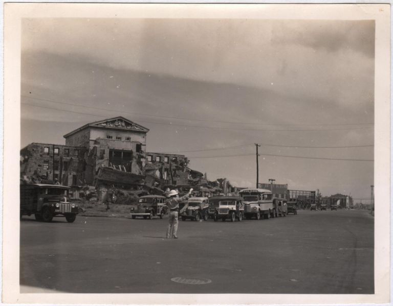View down Taft Avenue in Ermita and the ruins of the Legislative Building on left. We know it's the Legislative Building because of the carving on the pediment (see OFI-003765 and OFI-000178.