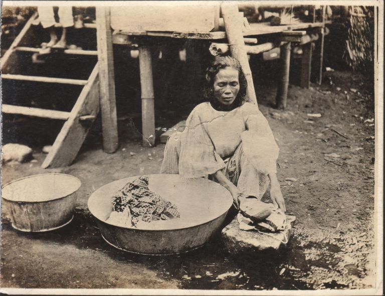 Subject: The obligatory shot of a "lavandera" or laundress. A Filipino woman washes clothes in a washtub on the ground. The zinc washtubs are called "batyas."
