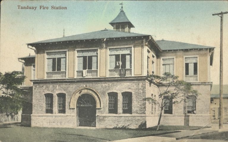 Subject: Well- maintained brick and wood two-story firehouse in Tanduay, a triangular region encircled by the estuaries of San Miguel and San Sebastian in Manila.