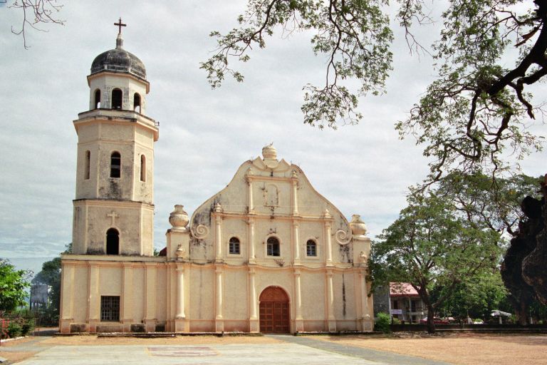 Subject: Front facade and bell tower of Tayum Church. The Santa Catalina de Alejandria Parish Church, commonly known as the Tayum Church, is a 19th-century Baroque church located at Brgy. Poblacion,