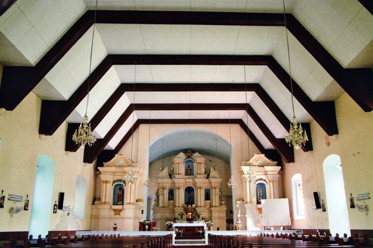 Subject: Interior view toward altar of Tayum Church. The Santa Catalina de Alejandria Parish Church, commonly known as the Tayum Church, is a 19th-century Baroque church located at Brgy. Poblacion, Ta
