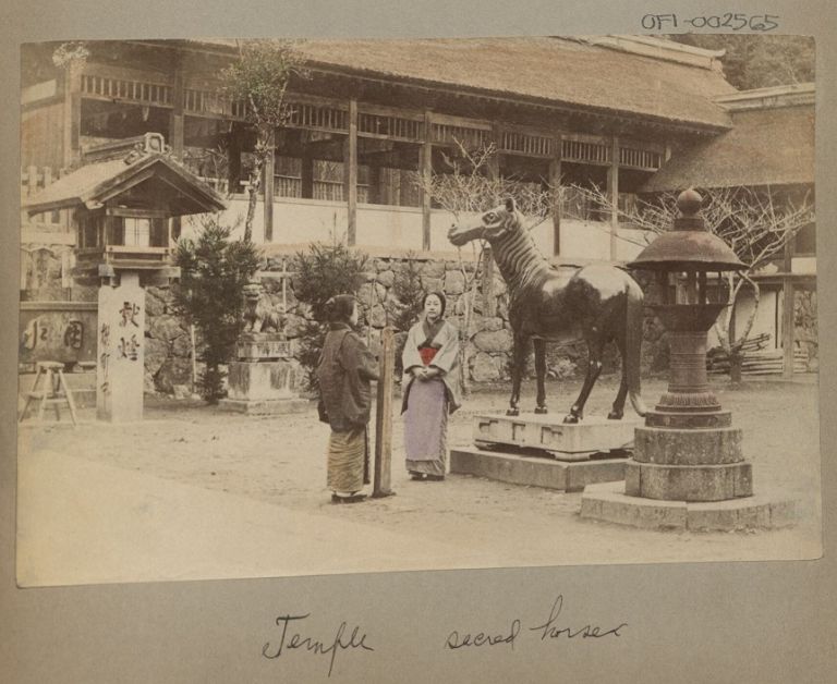 Subject: Two Japanese women stand by a horse statue at the gate to a temple. In Shinto, horses are thought to be intermediaries between this world and that of the kami. Still toda