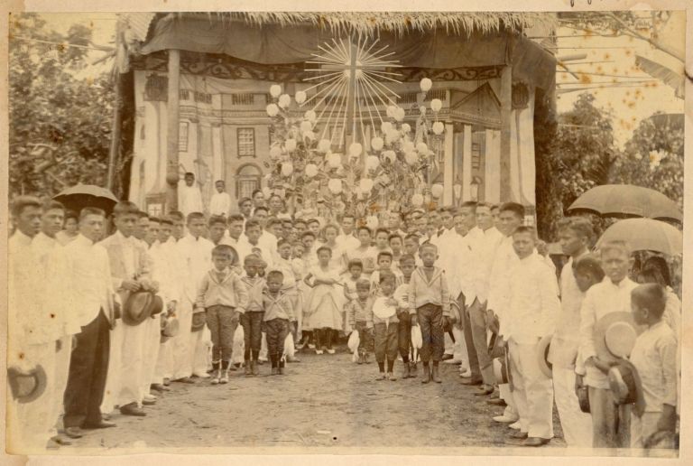 Group portrait photograph of the cast and crew of a Philippine theater, posing outdoors in front of their stage and set, which is in an open nipa-roofed structure.