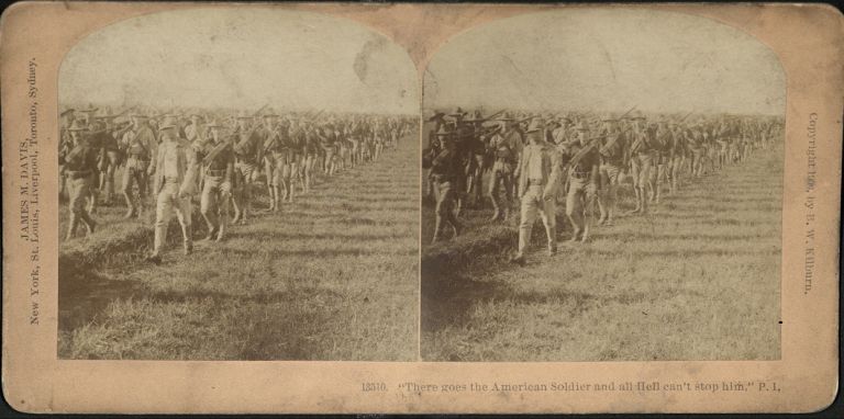 Kilburn #B13510. U.S. soldiers march in rows across a field in the Philippines.