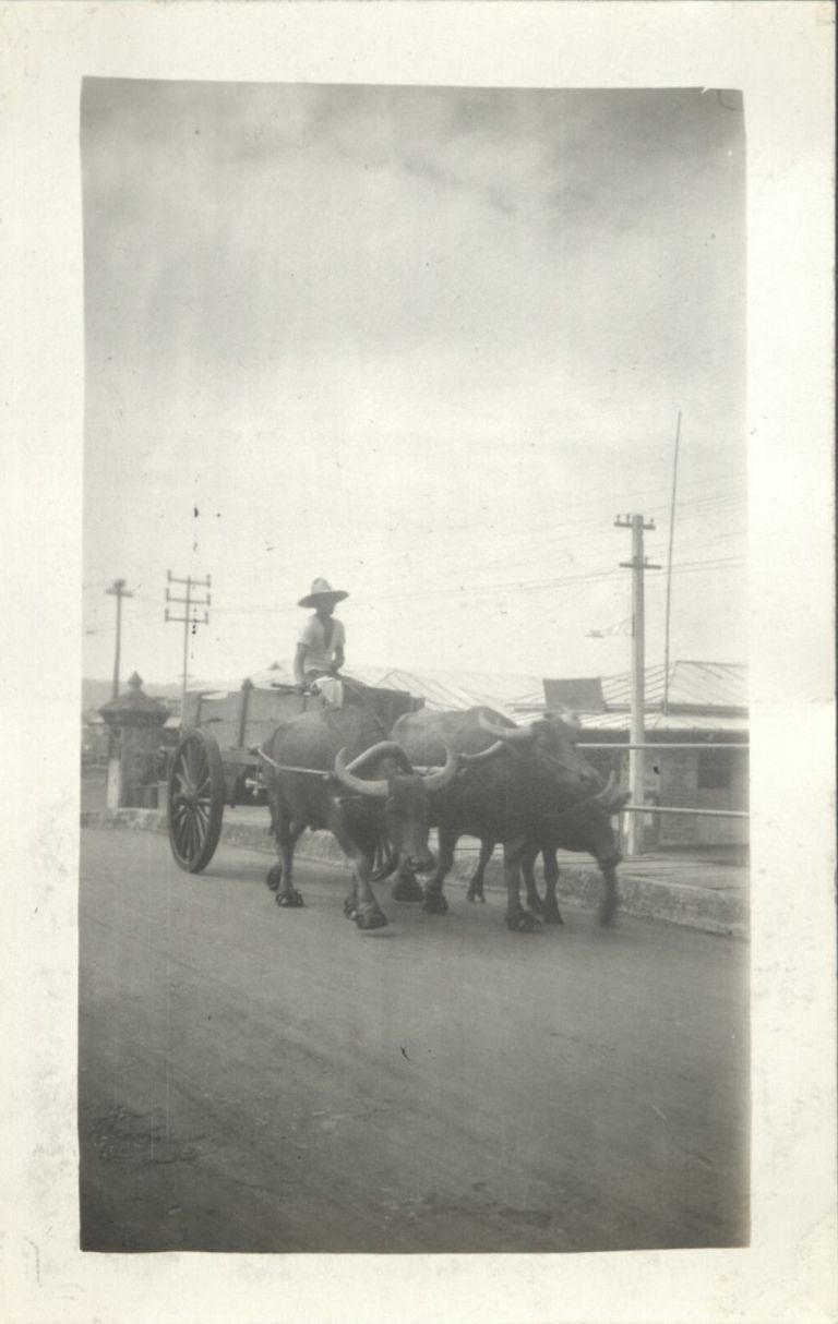 Subject: Team of three carabaos pulls a large wagon down a street, likely in or near Legaspi City.