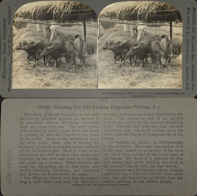 Keystone #K10068-I. Filipino farmers use 4 carabao to trample rice stalks to remove, or "thresh out," the grains.