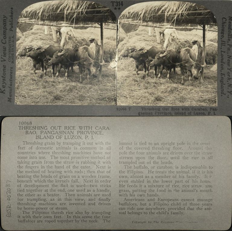 Keystone #K10068-I. Filipino farmers use 4 carabao to trample rice stalks to remove, or "thresh out," the grains.