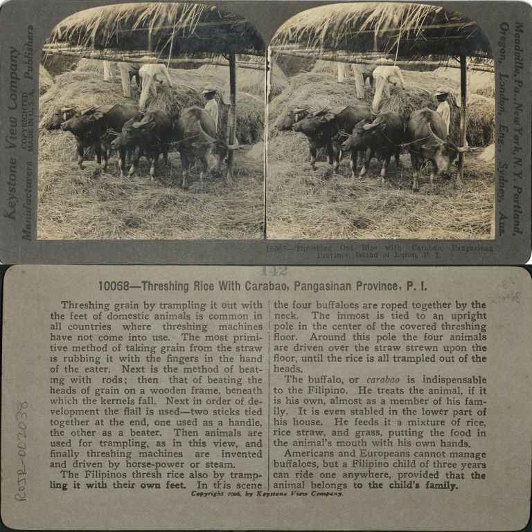Keystone #K10068-I. Filipino farmers use 4 carabao to trample rice stalks to remove, or "thresh out," the grains.