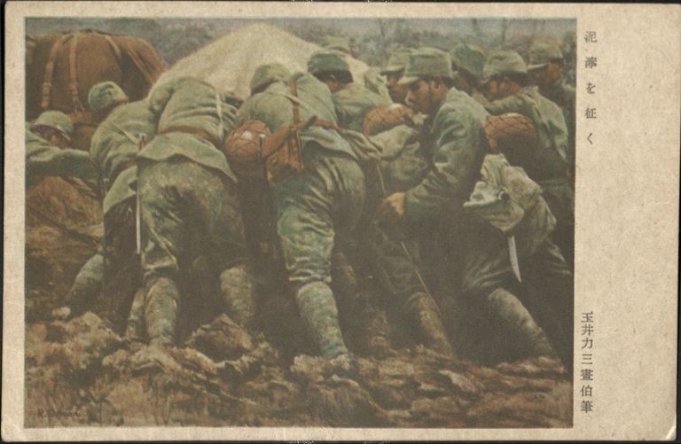 Subject: Group of Japanese soldiers pushing a heavy cart through mud.