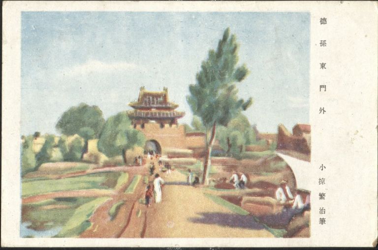 Subject: Watercolor picture of people walking along road past farms to temple in distance.