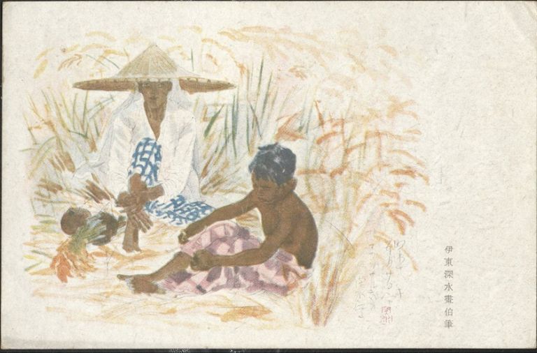 Subject: Watercolor picture of woman in broad hat and child sitting in rice field.