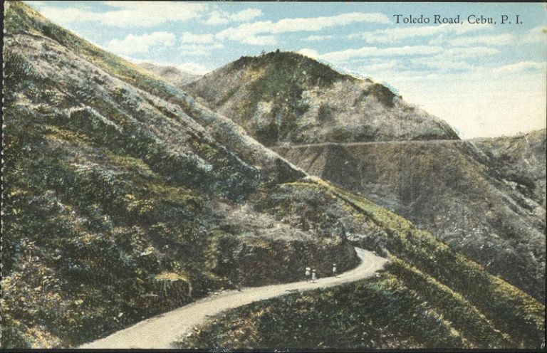 Subject: People walking on road cut across steep hills with low vegetation on Cebu. See also OFI-004305 for same image as a real photograph. The road cuts across the island from Talisay City, near Ceb