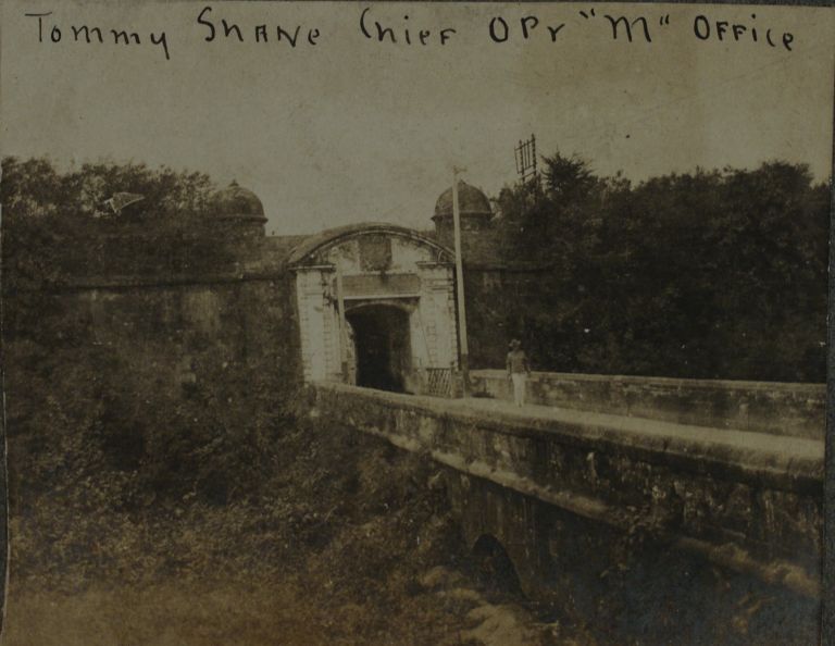 Subject: A U.S. Army Signal Corps man poses on the bridge to Revellin de Real de Bagumbayan, outside Puerta Real in Intramuros. The revellin functioned as a defense for a gate where cannons