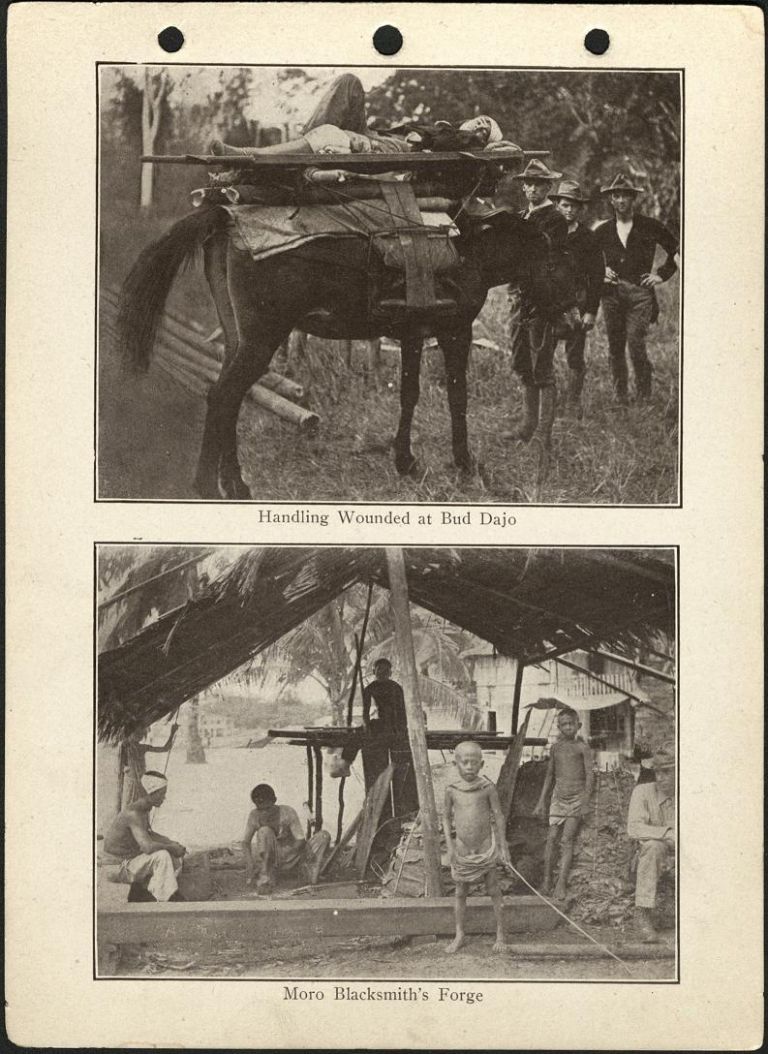 (Top) Handling wounded at Bud Dajo. / (Bottom) Moro blacksmith's forge.