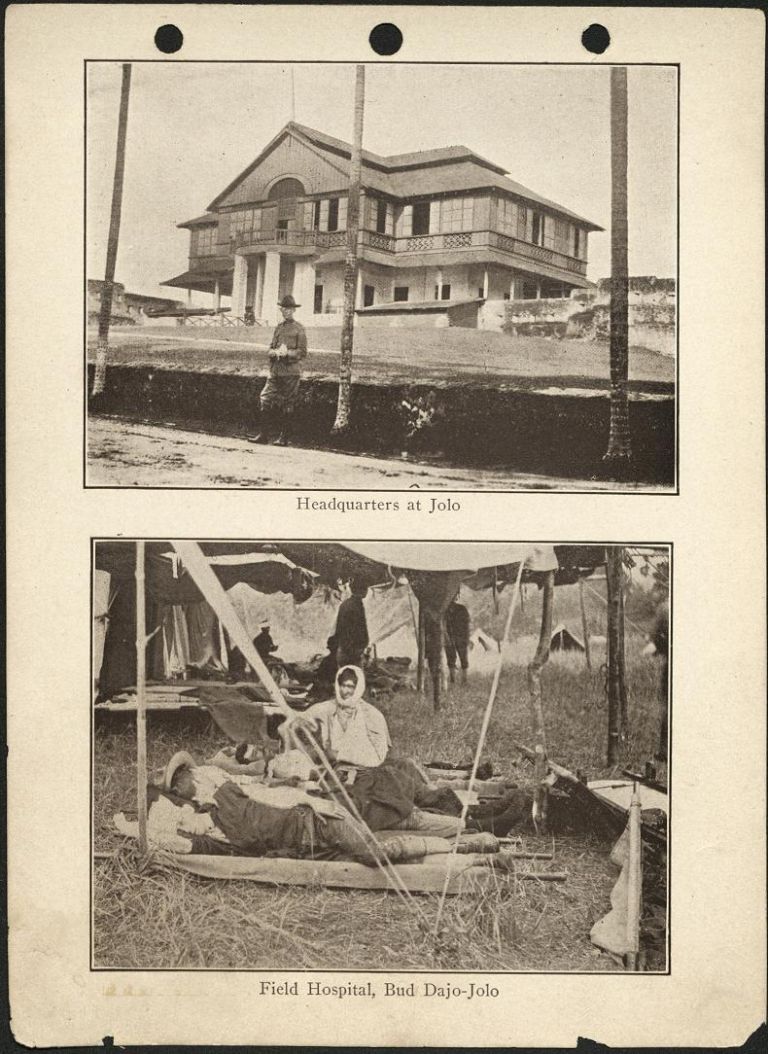 Subject: (Top) New U.S. Army headquarters building in Jolo. (Bottom) Wounded U.S. soldiers from the Battle of Bud Dajo during the Moro Rebellion in 1906, which culminated in the Moro Crate