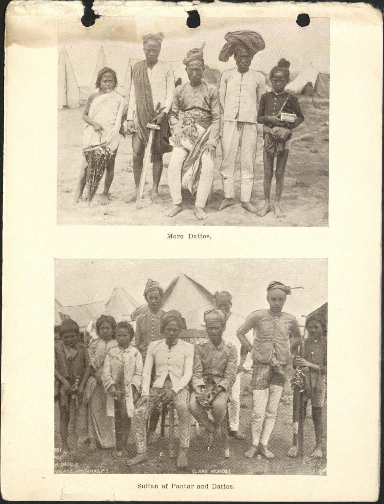 (Top) Moro dattos. (Bottom) Sultan of Pantar and dattos. Camp Vicars, Lake Lanao.
