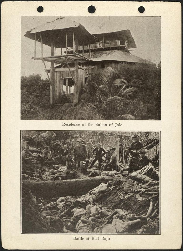 Subject: (Top) Two-story home of the Sultan of Sulu in Jolo with covered balcony or watchtower. Also a postcard, see ROJR-000806. (Bottom) The Battle of Bud Dajo during the Moro Rebellion