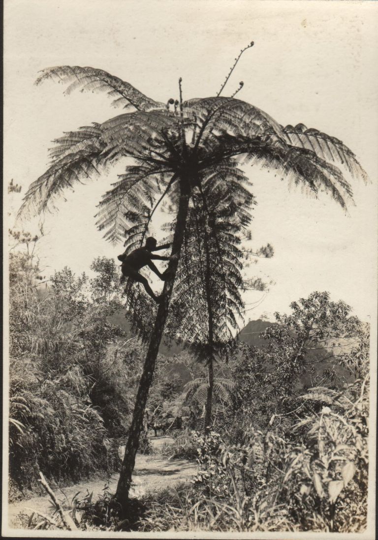 Subject: A Filipino climbs the trunk of lone tree fern. Tree ferns grow in tropical and subtropical areas, as well as temperate rainforests in South Africa, Australia, New Zealand, and they can reach