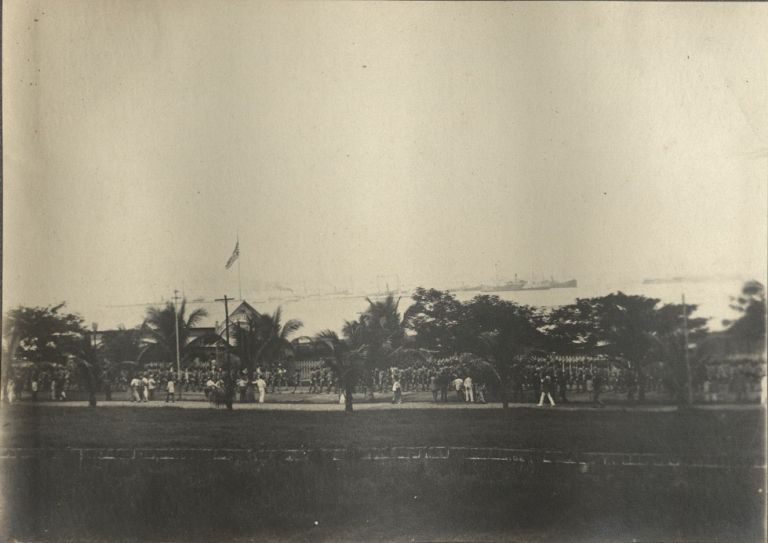 Subject: Soldiers in formation and civilians in port district looking over Manila Bay. This is probably taken from inside Intramuros looking over the walls and the civilians are on Bagumbay