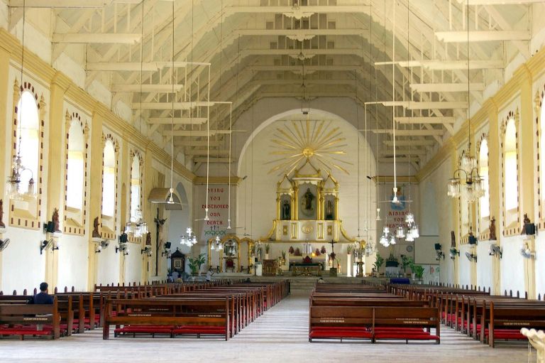 Subject: Interior, pews, altar, and ceiling of Saint Peter Metropolitan Cathedral, also known as the Tuguegarao Cathedral. The church, originally built by Dominican friars and completed in 1768, is th