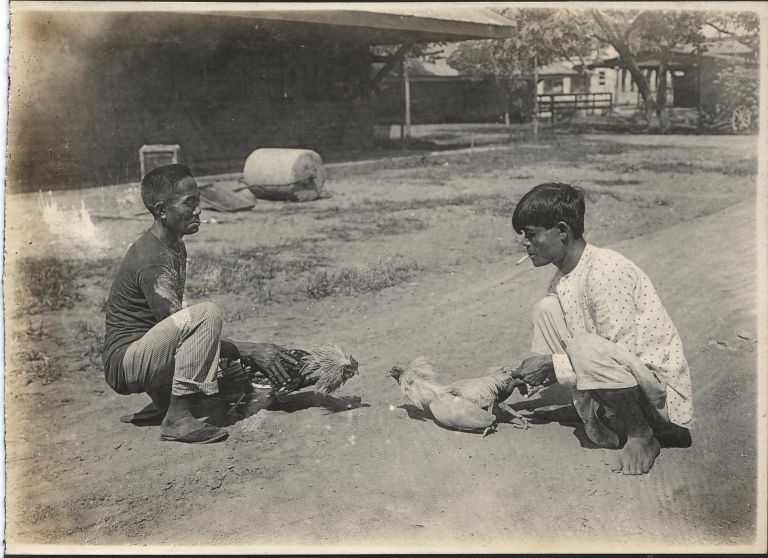 Subject: Two Filipino men squat on the ground, holding their fighting cocks. They may be training the birds rather than fighting, as there is no crowd of Filipinos around placing bets on the outcome.